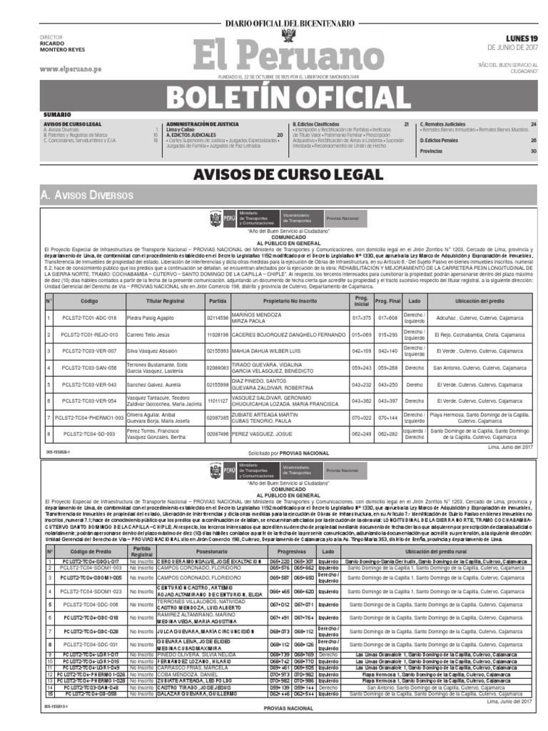 Consulte las publicaciones que realizan diariamente las municipalidades en la sección legal del diario oficial. Límites, método de prueba y marcado. El nuevo diario suspende publicación. 89 del cgp por la ley 19.090, puede sustituirse la publicación en otro diario por la declaración jurada de no haber obtenido tal publicación gratuita. Llame telefónicamente al 22 486 3600 opción 4.